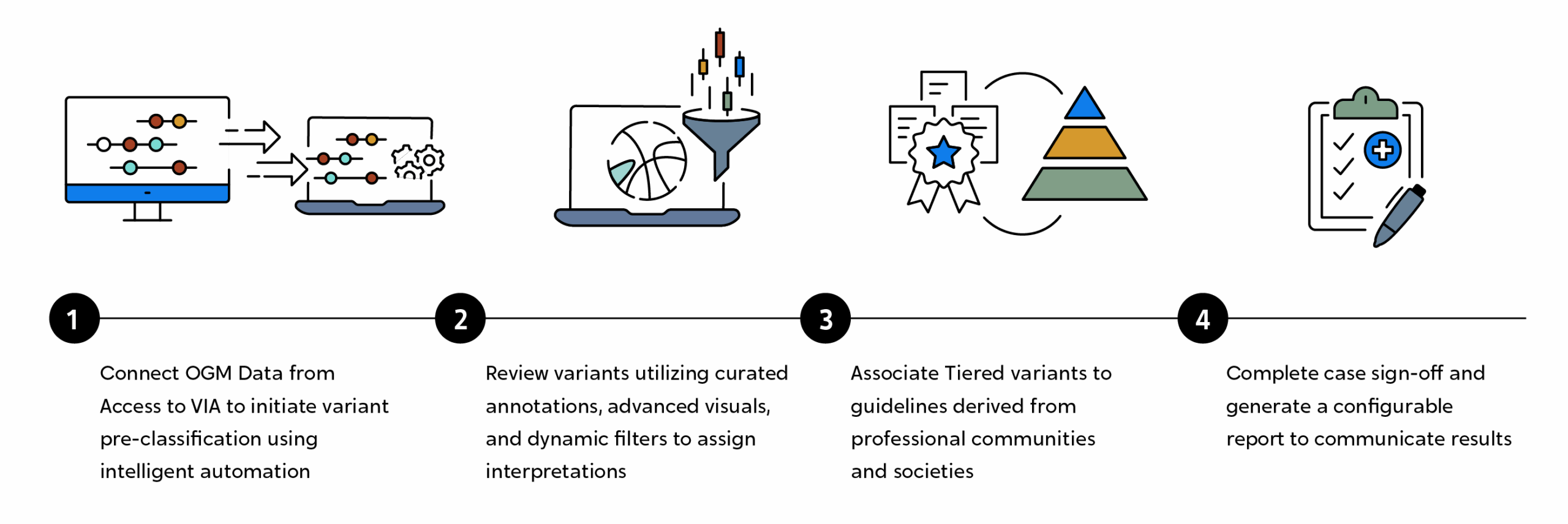 Existing data analysis solutions for genomics are laborious, time-consuming and incomplete. You have to manage various systems, navigate complex workflows and spend inordinate amounts of time hunting for annotations and creating data visualizations. Good news: those days are over. VIA software radically simplifies your sample-to-report workflow and empowers you to deliver more clinically relevant answers from across technologies faster. VIA brings various data types into one view and automates variant calling, interpretation and annotation, so you can reduce turnaround times and optimize operations at every step.